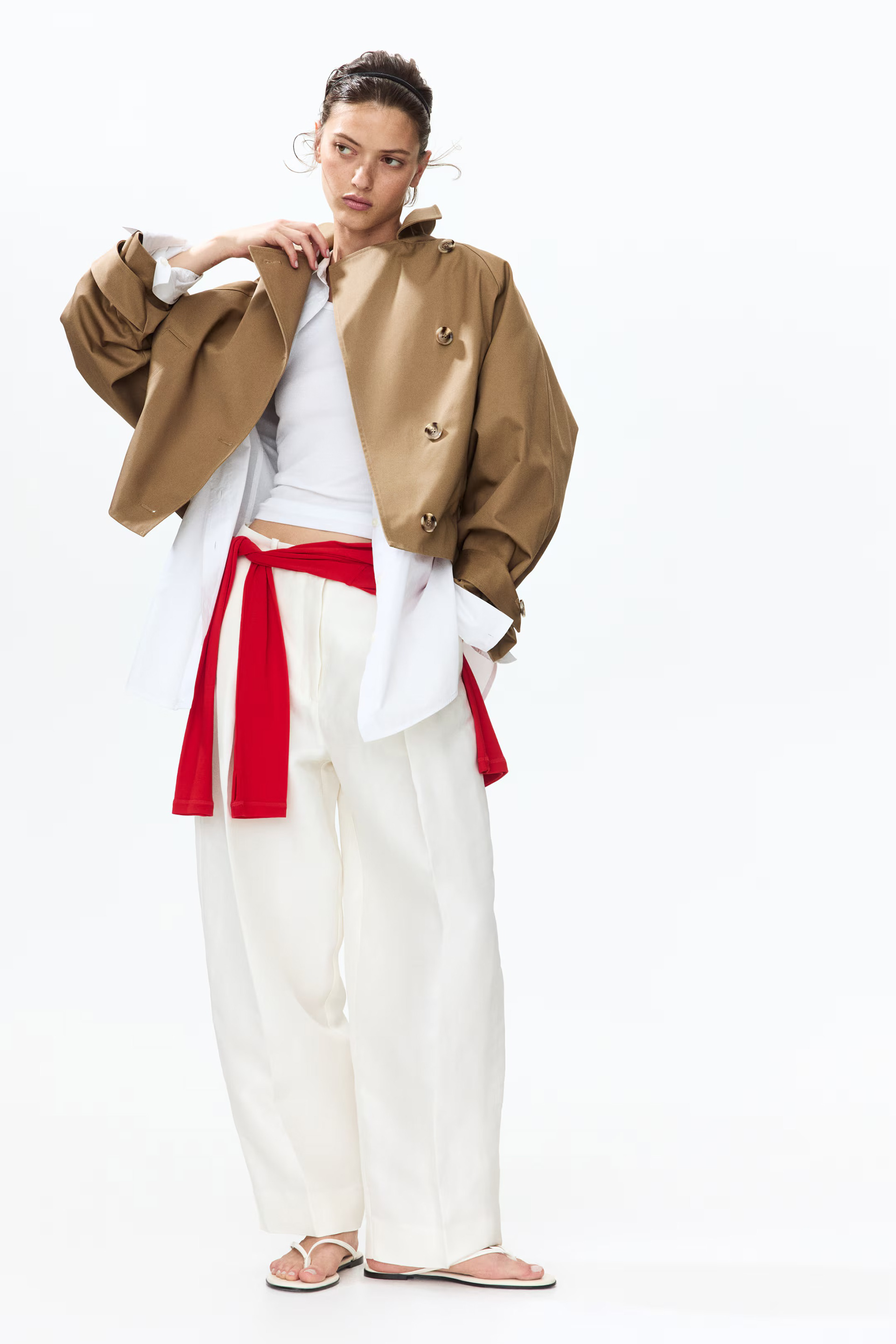 Short trench jacket developed from concept to final product. Design evolution focused on collar construction and integration of the scarf detail, refining proportions and overall silhouette. Active involvement during fittings and product development process.